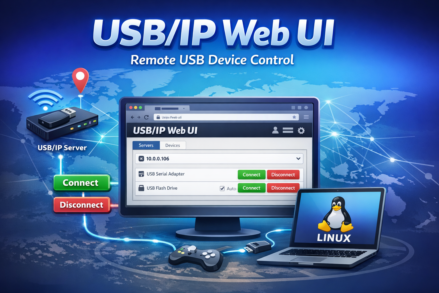 USB/IP Web UI es una pequeña aplicación, realizada en NodeJS, que instalas en tu PC Linux (cliente) para poder: